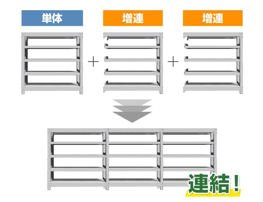当店で取り扱っているボルトレスのスチールラックは、連結して組み立てを行うことが可能です。