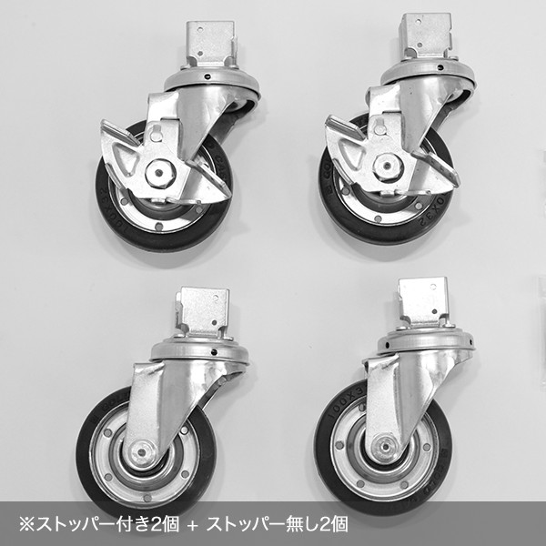 | キャスター部材 | キャスター4個 ※ストッパー有り無し それぞれ2個ずつ キャスター固定用ボルト ロックピン交換用ビス 取付説明書 |
